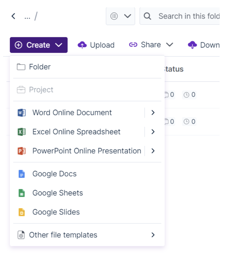 When creating a new file, simply click on the “Create” drop-down button in Egnyte and you will see the various file types to choose from and create based on your need.