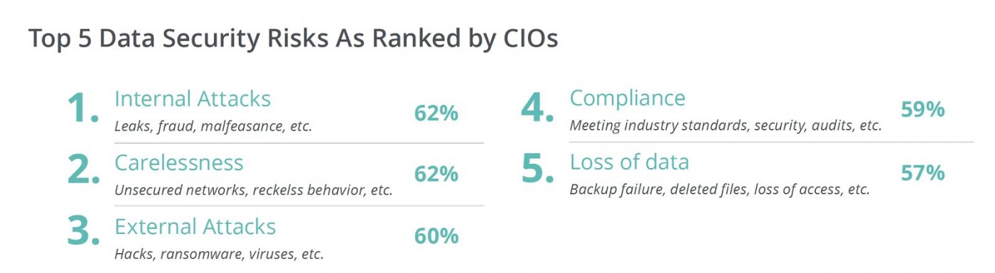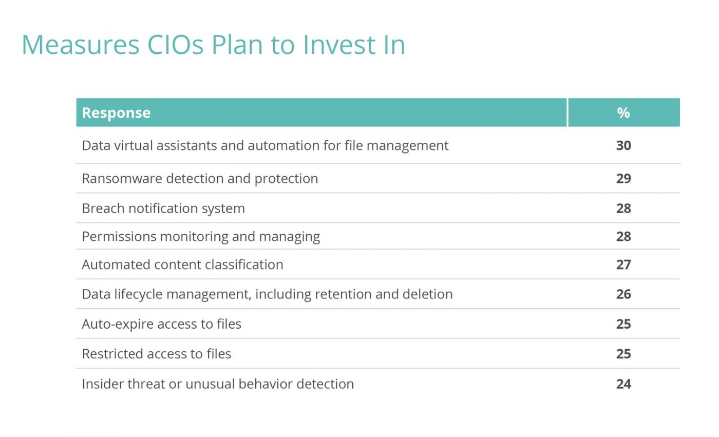 The bottom line, not surprisingly, is that remote work increases the level of difficulty of proper data governance and security to prevent attacks like hacks, ransomware, and data carelessness. Only 29 percent of CIOs surveyed gave their employees an “A” grade for maintaining file security and ensuring proper data governance during COVID-induced remote work. From content sprawl in multi-cloud environments to unsecured WiFi to shared computers within a household, the new remote work reality has created a laundry list of new challenges for CIOs.