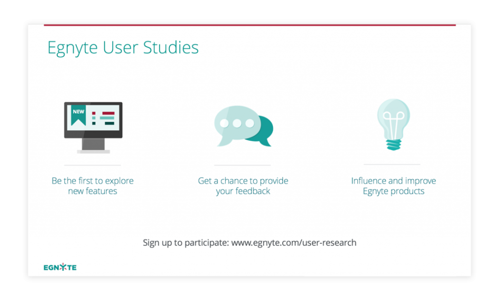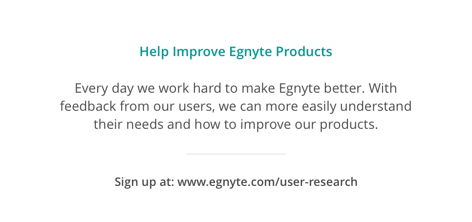 Recruitment is the first step User research recruitment is just the first step in the user research process, but a step that may set people back. Once we recruited participants, we had a gentle push to move forward with the research process. We used that momentum to set up a user research process that works for our team and iterate on our recruitment methods. Hopefully, this article sheds some light onto our recruitment process at Egnyte. If any part of this article resonated with you and you want to help us out, please sign up to participate in Egnyte User Studies.