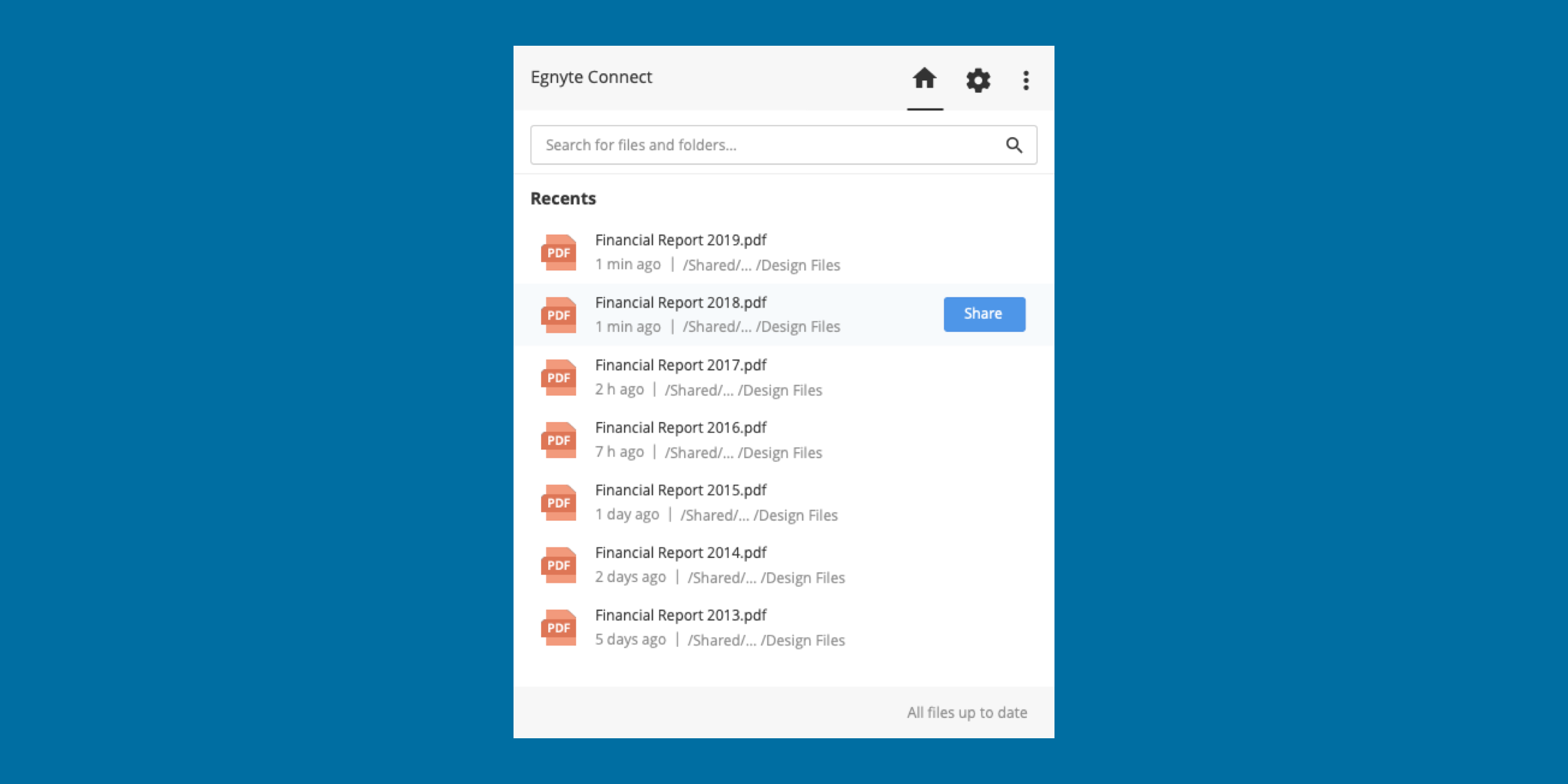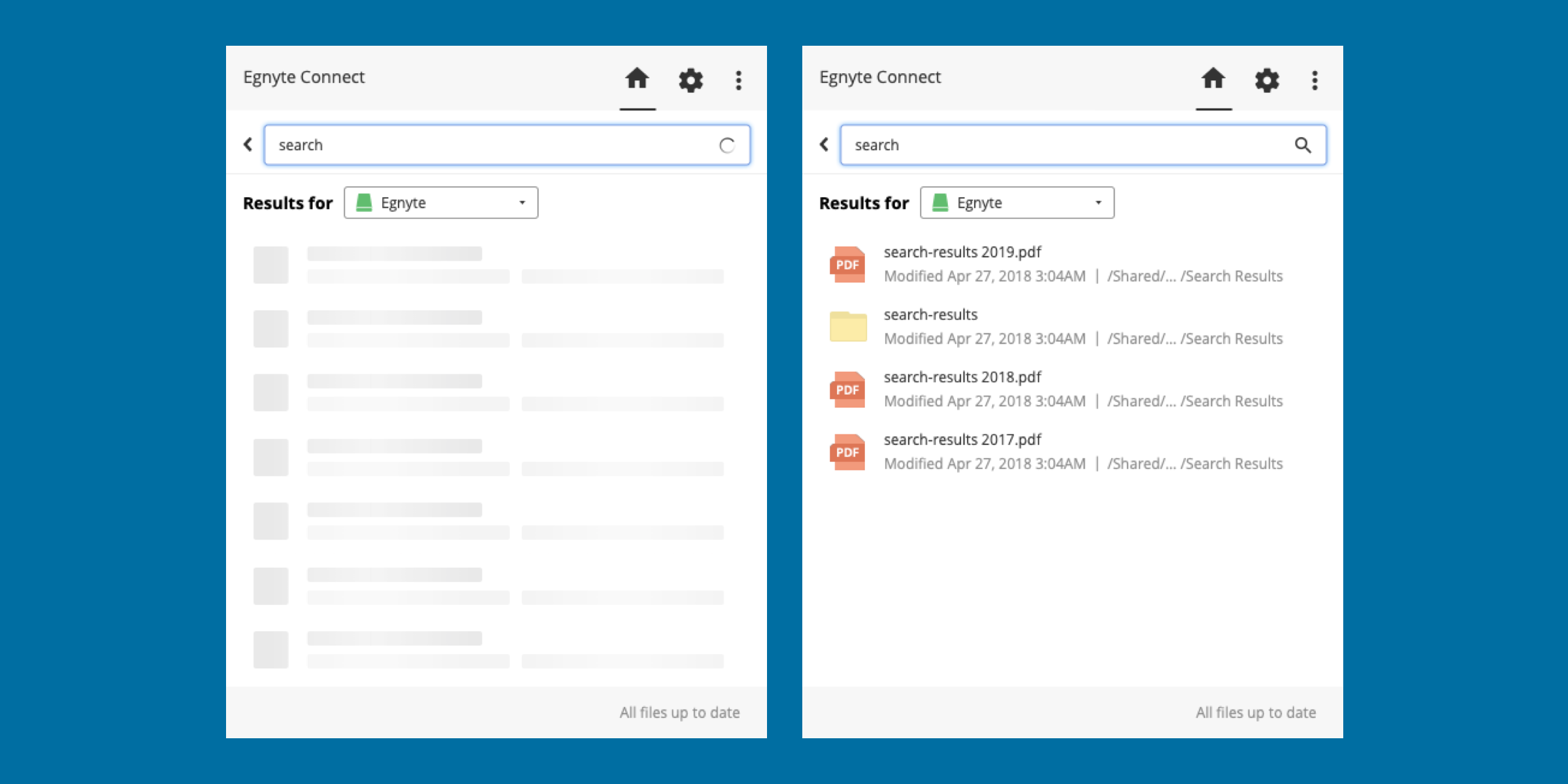 Egnyte Connect Desktop App 3.5 helps you to get you your files faster with a list of recently accessed files and an option to search all your content in the cloud.  Click a recent file or a search result and it’ll open right on your desktop.