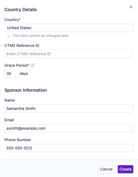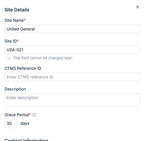 Use the Add a new site button to bring up the new site form and fill it out.  Give a name and ID to the site and optionally enter contact information for the site.  Repeat this for each of the sites in your study, making sure you enter the sites in the right country.