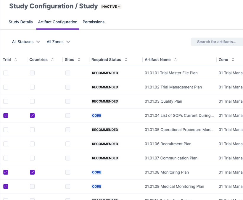 Open the Artifact Configuration tab in the Study Configuration to choose which artifacts are required at the trial, country, and site-level.  The app shows the reference model recommendations and allows you to filter and search the hundreds of artifacts to make your selections.
