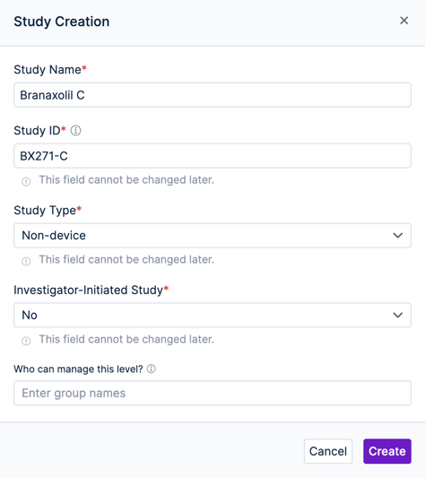 • The Who can manage this level? option lets you specify an Egnyte user group who can be assigned as Study managers.
