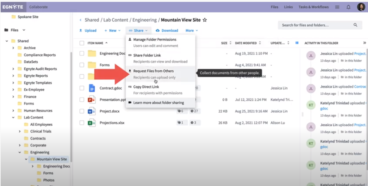 If the CRO only needs to upload a few files, there is an easy and secure way to request files using Egnyte. Simply go to the designated folder in Egnyte and click on Request Files from Others in the Share dropdown menu.