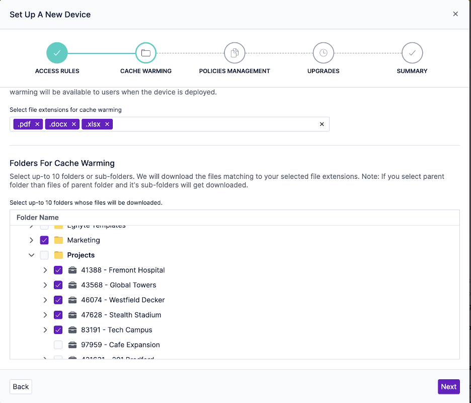 Smart Cache v4.0 has customizable settings that make it easy to optimize performance for complex applications like Autodesk's AutoCAD and Revit, which have large file sizes with interlinking references. By loading data from an optimized local cache instead of Egnyte’s Cloud, you can significantly enhance performance on first use. Setting up cache warming is as easy as two quick steps: