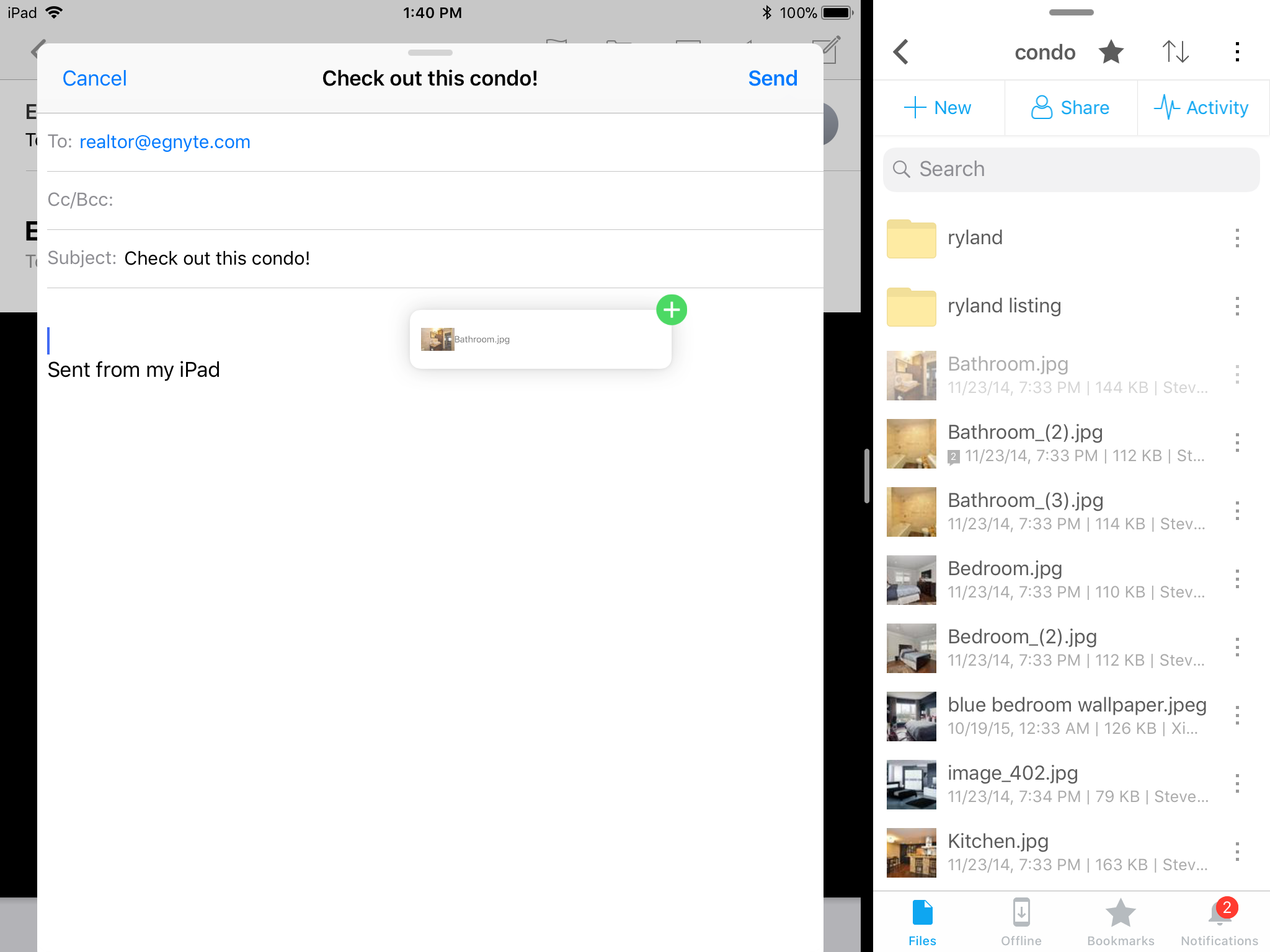 In response to iOS’ new split screen view and support for drag and drop (available for iPad only), we’ve added the ability to send attachments by dragging Egnyte files directly into your email. While in split-view, simply long tap on your Egnyte file and drag it into the iOS Mail app.