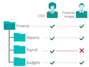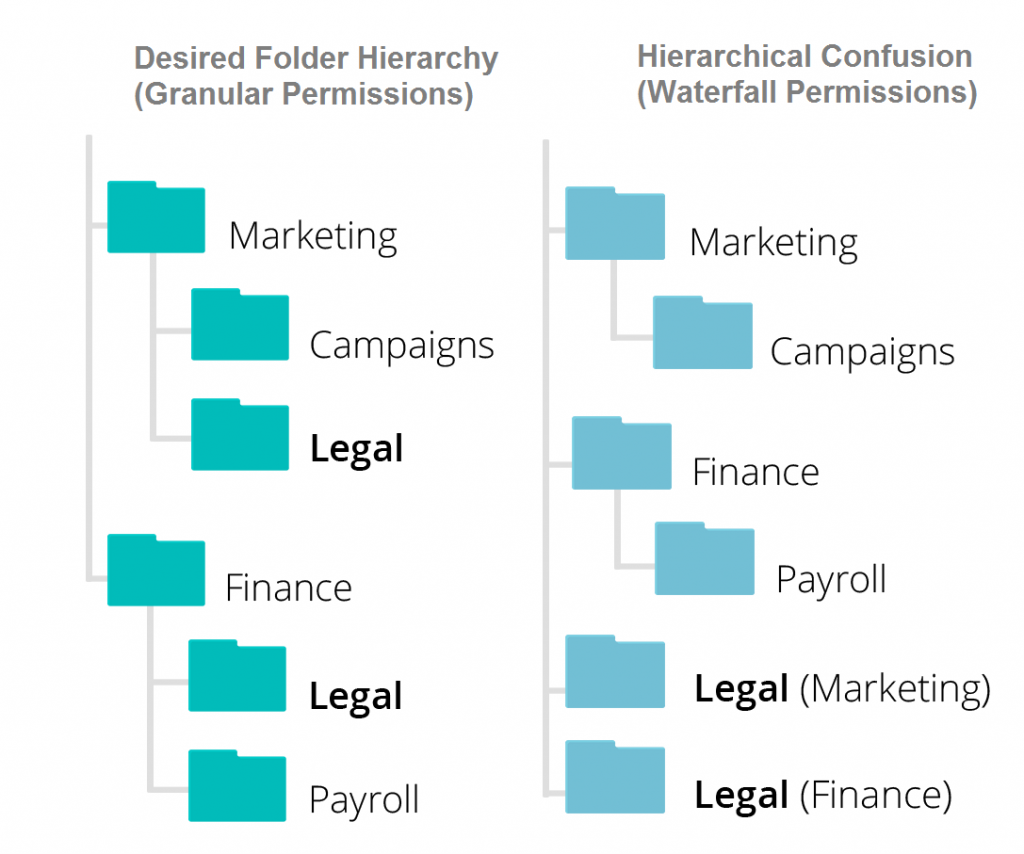 Figure 1. The need for unique permissions for subfolders. Subfolders inherit user permissions from their parent folders by default, but inherited permissions can be overridden as needed.When your business moves to a cloud-based file sharing solution, you may rightly expect your cloud infrastructure to mimic the file server permissions model. However, with Consumer-first file sharing solutions, you’d run into problems.Take vendor B, for example, who implements a ‘waterfall’ permissions model that does not allow inherited subfolder permissions to be modified.Imagine you’re the CFO of a company. You obviously need access to the top-level Finance folder and all its nested subfolders, including those that contain sensitive payroll information. No problems so far. Then you hire a financial analyst, who should be able to access the Finance folder and all its subfolders except a few like Payroll that contain sensitive, confidential information (figure 1).You can't do that with vendor B. Because it does not allow for the Payroll subfolder to have different access permissions than its parent Finance folder, for a given user. As a workaround, subfolders requiring unique user permissions have to be moved to the top of the folder hierarchy, which creates more problems. Users now have to deal with a top-heavy hierarchy and lose track of the positional relationships between these folders and their former parent folders. Modifying folder hierarchies (figure 2) to accommodate the limitations of vendor B results in lost productivity for both users and administrators.