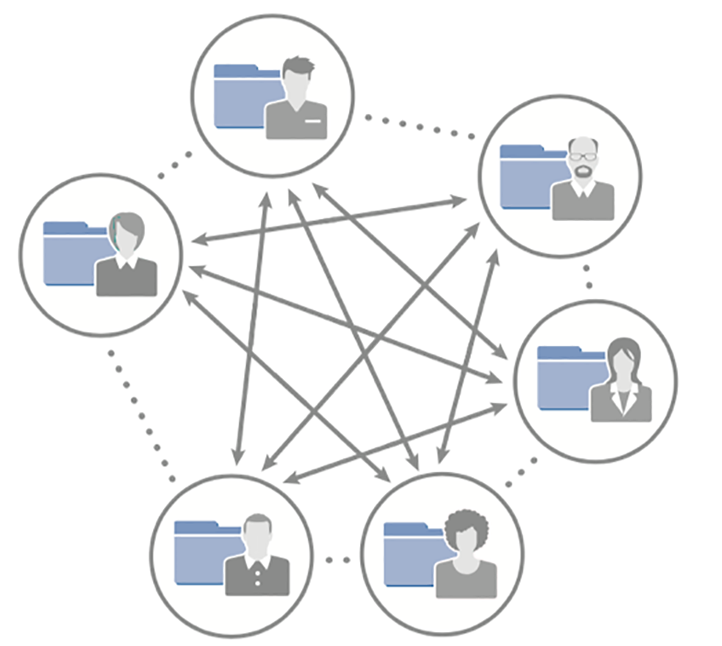 Figure 3. Consumer-first file-sharing solutions: a collage of individual accounts creating islands of content The absence of a centrally managed repository also creates numerous administrative challenges, and limits the ability of the vendor to roll out a rich enterprise feature-set.Overcoming the Permissions ProblemThe only real fix for the permissions problem, and other problems resulting from Consumer-first file sharing architectures, is to switch to a Business-first File Sharing solution.