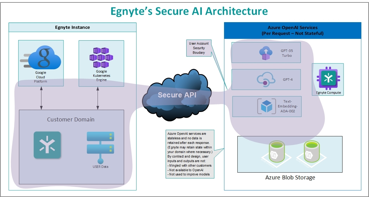 Egnyte takes the responsibility to protect the data of our customers very seriously. Our architecture has been assembled and integrated to prevent leakage of customer data outside defined security boundaries. Even as data is passed to a service, like Azure OpenAI, it is confined to staying within a security boundary and encrypted in flight. More importantly, the security boundary for that user is temporarily extended to the service only when needed and then retracted after the transaction occurs. All user data is purged from the AI service between transactions and is never exposed to other users or Egnyte’s employees or, to the AI service provider.