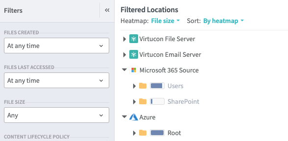 On the left side are filters for the files you are viewing, along with the file structure that Egnyte has detected. Note that in this case, Egnyte has scanned a SharePoint file structure, along with some files stored in Microsoft Azure.