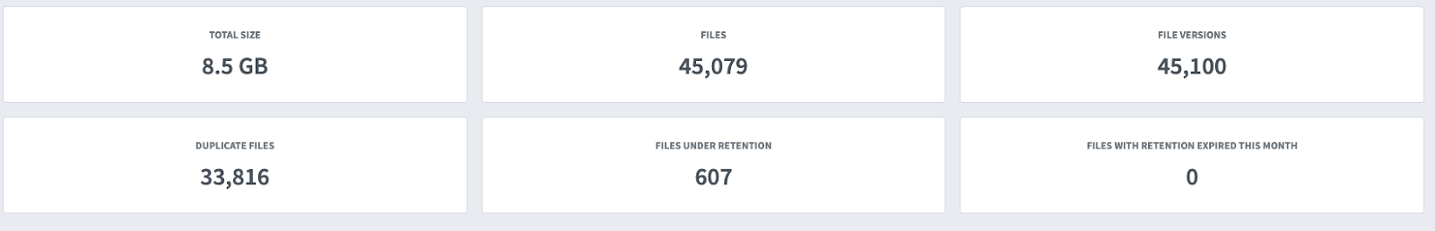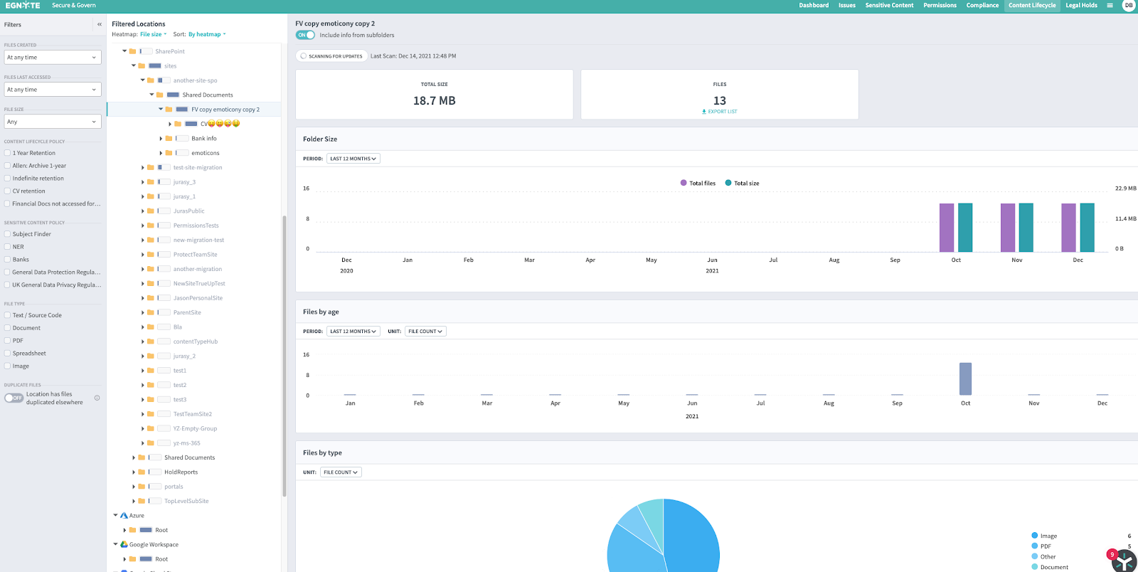 First, go to the Secure & Govern page in Egnyte and select the Content Lifecycle tab. You will get a dashboard that shows exactly where your files are and how they are organized. The overall screen looks like the image below, but we will break it down into sections to review.