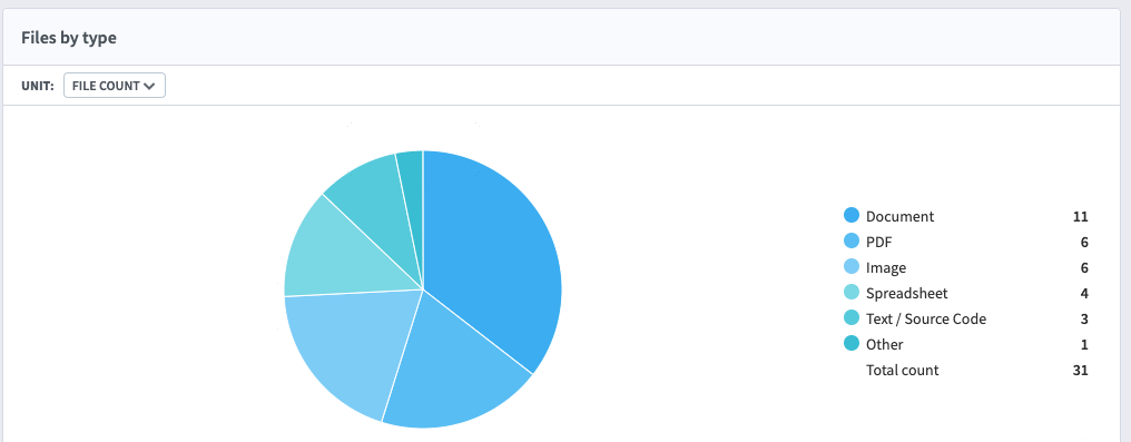 Finally, you will see a pie chart of files by type. Unlike searches within Teams or SharePoint, this includes all files—not just Microsoft-compatible file types.