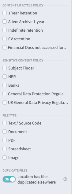 Finally, in the left column, you can also see the current lifecycle policies in effect, and you can filter on any sensitive content policies in effect.