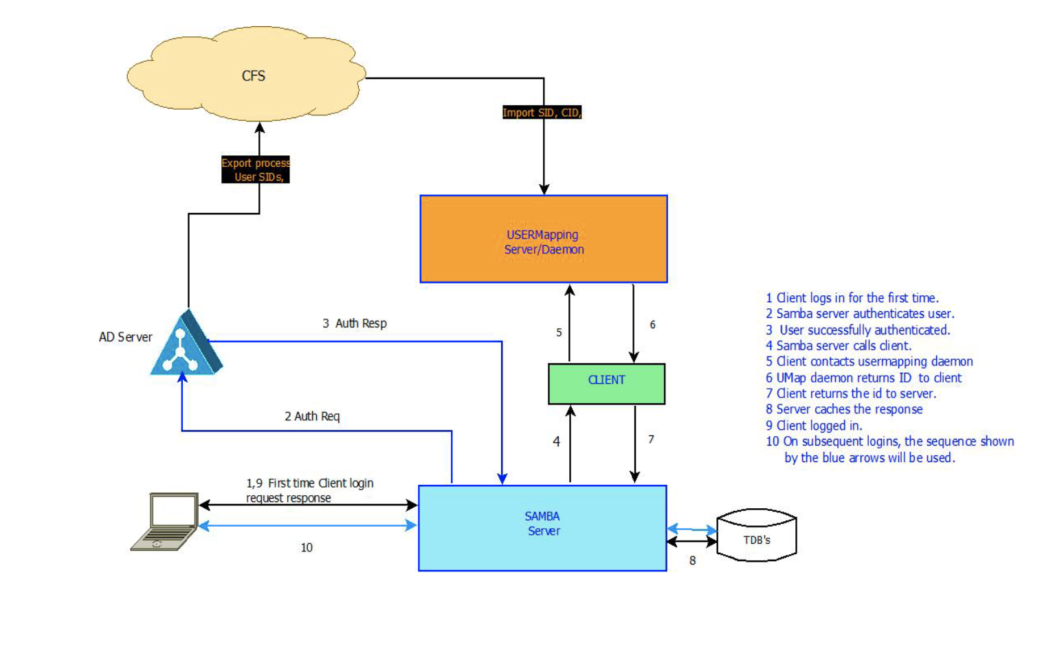 One of the mechanisms entails providing a backend script that provides IDs to the user. The format of the request and responses is well defined and published by the  SAMBA community. We leverage this mechanism to provide a client program instead of a script. This program communicates with a local ID mapping server process. The server process in turn talks to the Egnyte Connect cloud to synchronize the ID mapping information which includes the ActiveDirectory SID. Egnyte Connect cloud already has a process to synchronize the users information with ActiveDirectory and only needs to synchronize the SID in addition to other information.