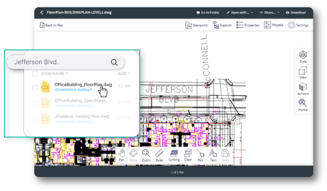 With Egnyte you can search for the file name or a specific term within the document, such as a street name or type of plan. First, open the web version of Egnyte—which is accessible from any device, even in low bandwidth areas. Go to the Search Bar and type in the search term. This will bring you a listing of files that contain the term. Click to open the one you want.