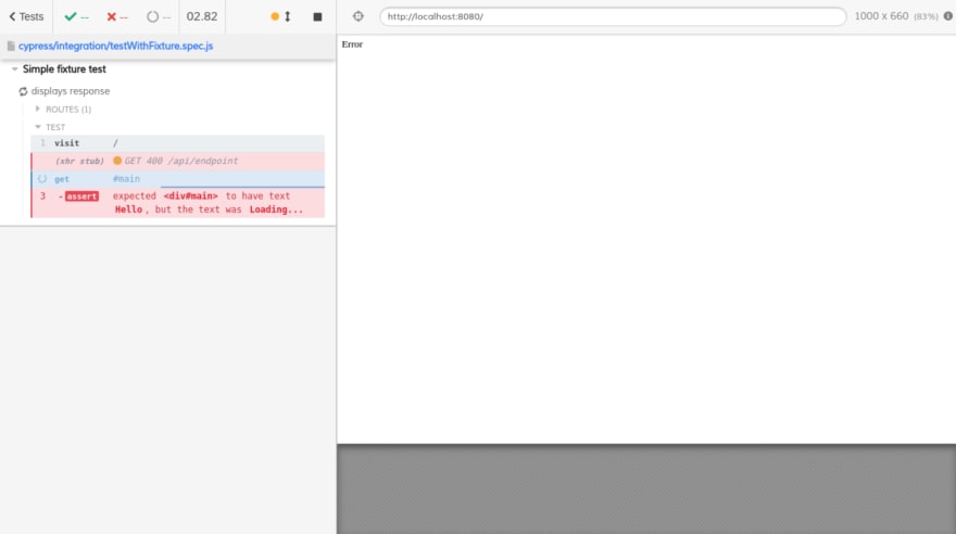 Ok, but where did our bug go?I've created a simple app to visualize the issue. In the beginning, the app displays the Loading… message, then makes a request and replaces the text with a downloaded response.Fetching the data in old, good XHR way.I've also written a test:And created a fixture file fixtures/exampleFixture.json:Have you noticed a bug yet?In my case, the screenshot from the failed test was very helpful. Cypress takes them by default for failing tests, which is neat!