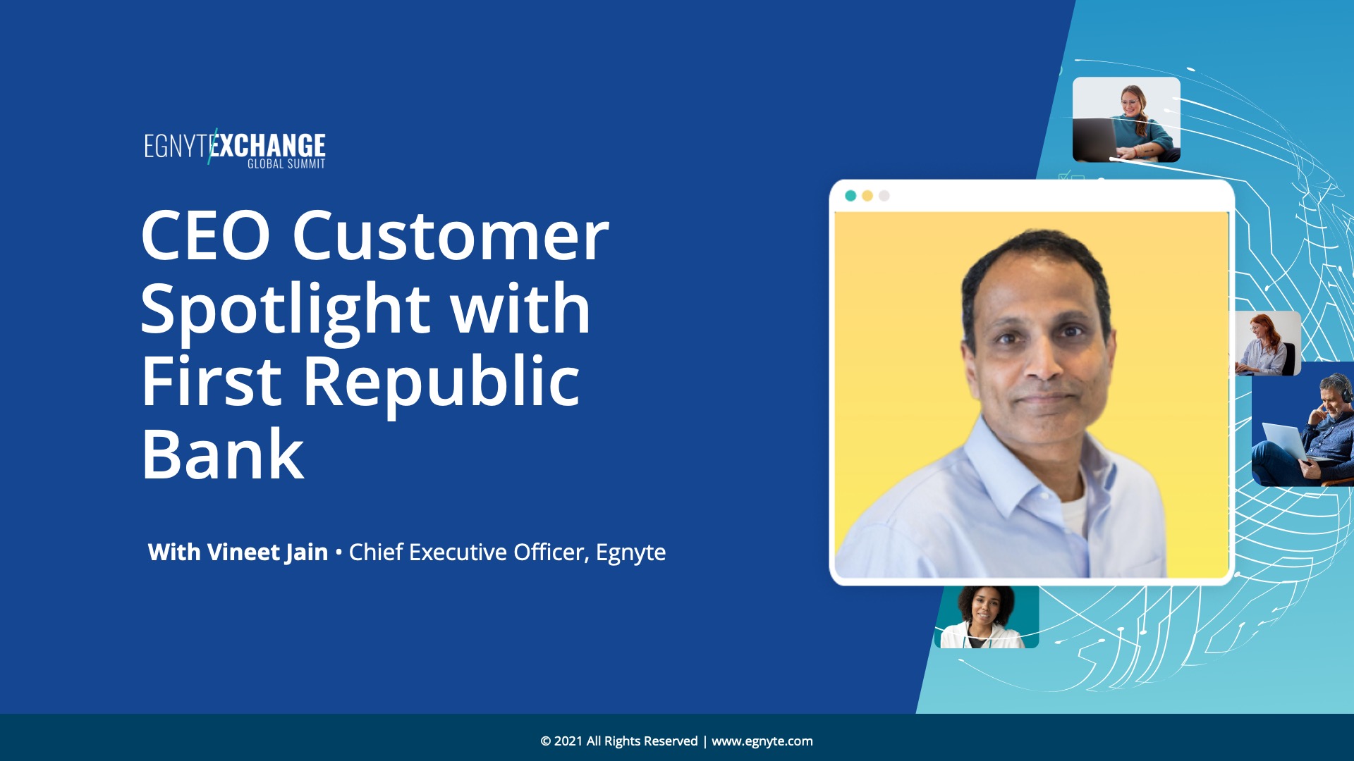 Learn about trends in the financial services industry, the intersection of content collaboration and data governance, and new techniques to adapt to the hybrid work era as Vineet Jain, Co-Founder and CEO of Egnyte, sits down with Joe Sarci, Deputy Chief Information Officer at First Republic Bank