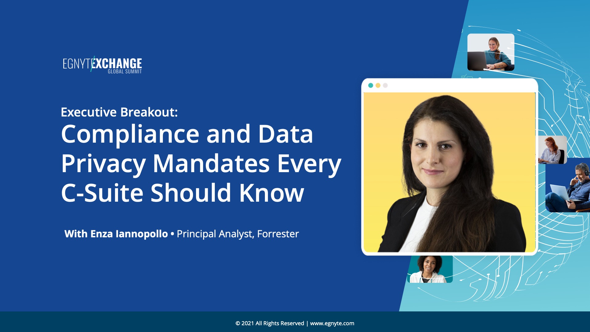 Learn about new compliance and privacy mandates important to everyone in the C-Suite. Hear from Enza Iannopollo, Principal Analyst at Forrester, and Certified Information Privacy Professional (CIPP/E), who helps organizations worldwide embed privacy and ethics into their strategic initiatives through approaches that deliver business growth while protecting customers’ and employees’ trust and brand reputation.