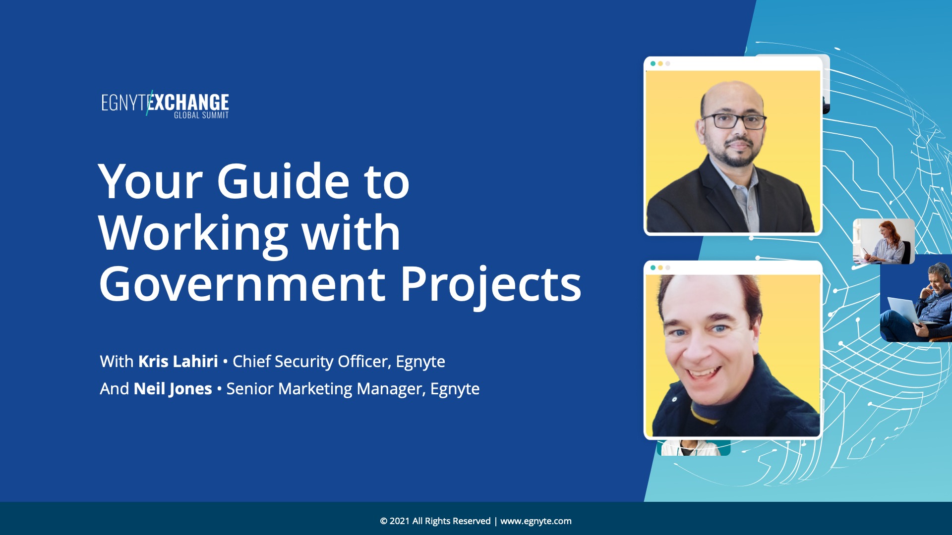 While working on government projects grows your business and provides stability during economic downturns, the complexity of additional regulations can be intimidating. In this session Kris Lahiri, Chief Security Officer at Egnyte, will provide an overview of relevant government regulations, talk best practices and demonstrate how egnyte.gov supports a compliant content environment.