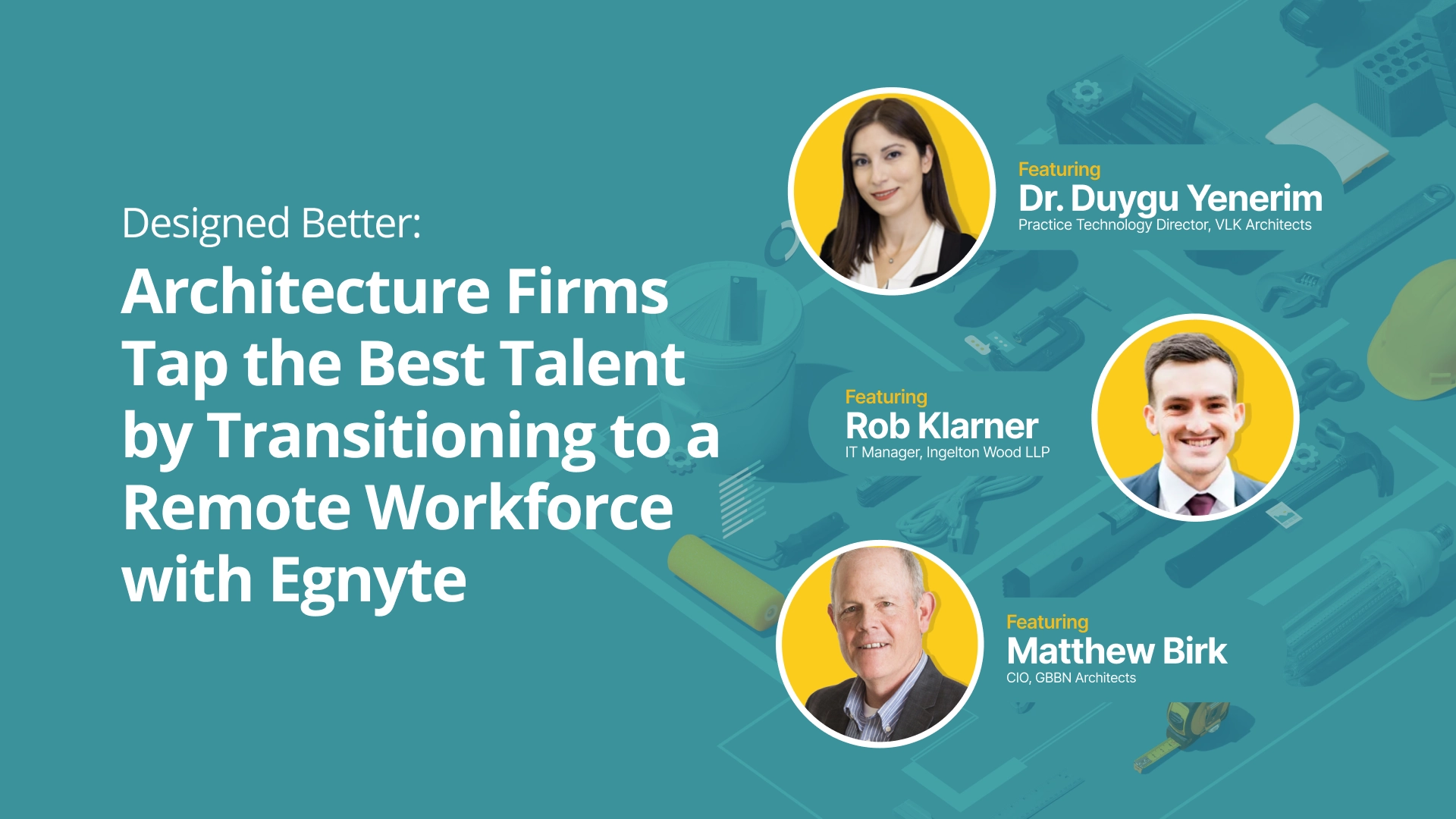 The event kicks off examining how intelligent data management is reshaping the AEC industry, accelerating firms' ability to be more effective and efficient, increase profits and reduce risk. We'll unveil Egnyte's latest purpose-built data management solutions for AEC, examine the rising use of metadata and common data exchanges and talk to three industry veterans about business transformation through intelligent data management practices.
