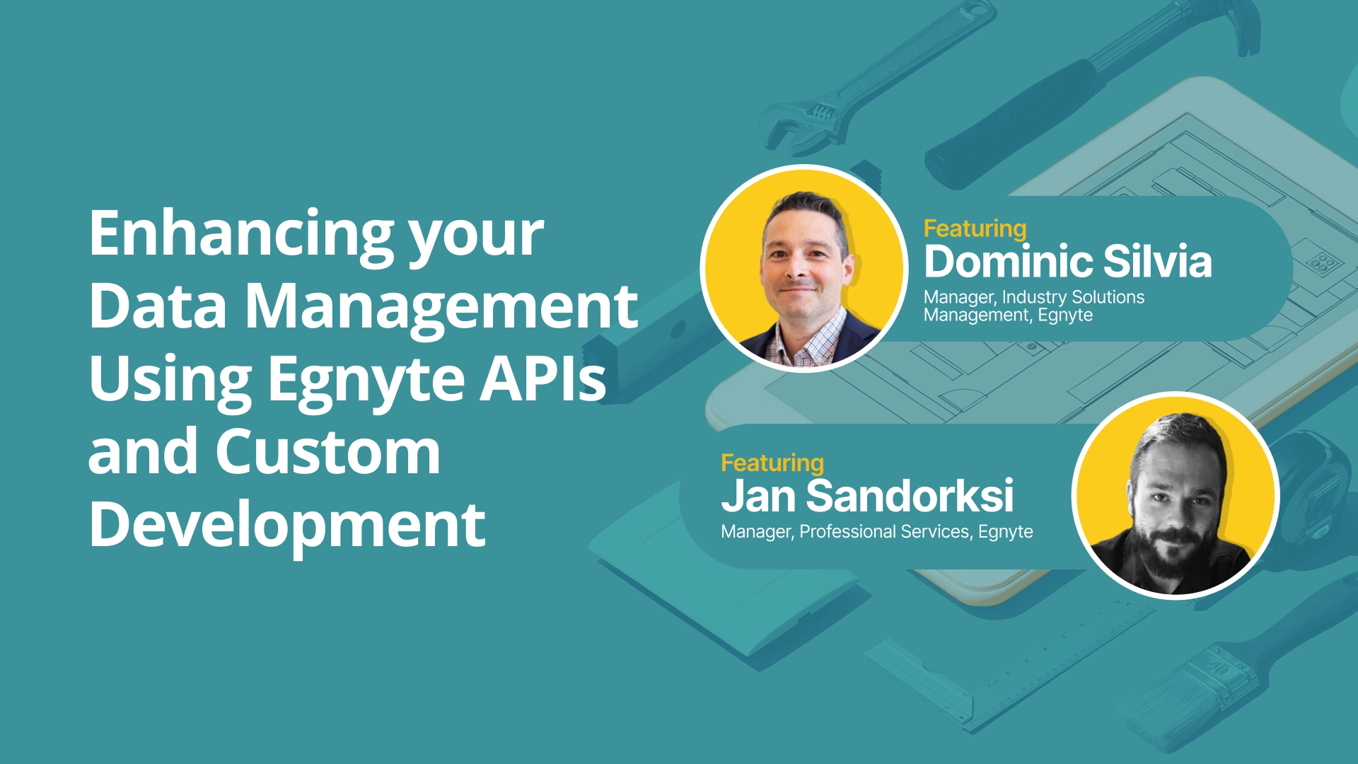 The Egnyte platform provides complete data storage, collaboration and protection capabilities ‘out of the box’. However, some companies may have unique data management requirements or needs that Egnyte doesn’t cover. These organizations can leverage Egnyte’s customizable platform, robust API, and Custom Development Team to automate data management tasks, saving them valuable time and money. Join Egnyte Professional Services Manager Jan Sandorski to learn about real-life examples of how AEC customers have leveraged the Egnyte platform for custom development, and get inspired for how Egnyte can help you take your Egnyte solution to the next level.