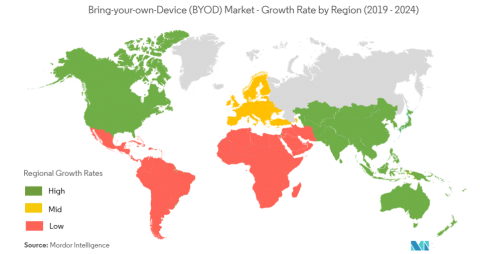 BYOD adoption varies by region and organizational type. The US and European countries, especially Ireland, Germany, Austria, and Switzerland, are currently trending in the middle of BYOD adoption. The Middle East and Africa have relatively low adoption. Asian countries and Australia have the highest rates of adoption.
