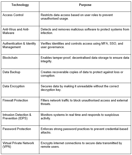 Modern data protection solutions rely on a layered approach that combines multiple technologies to prevent unauthorised access, detect threats, and ensure data resilience. Below are key tools that support a comprehensive protection strategy: