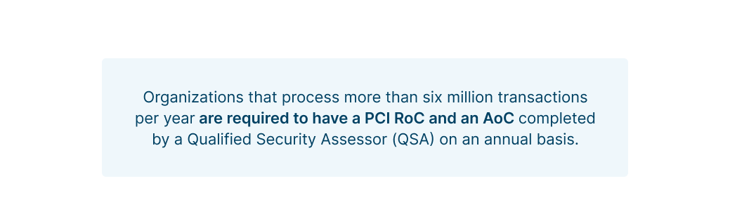 Validation is performed with the PCI Report on Compliance, also known as an Annual Report on Compliance (RoC, AoC). The requirements for this reporting vary according to the number of transactions processed.