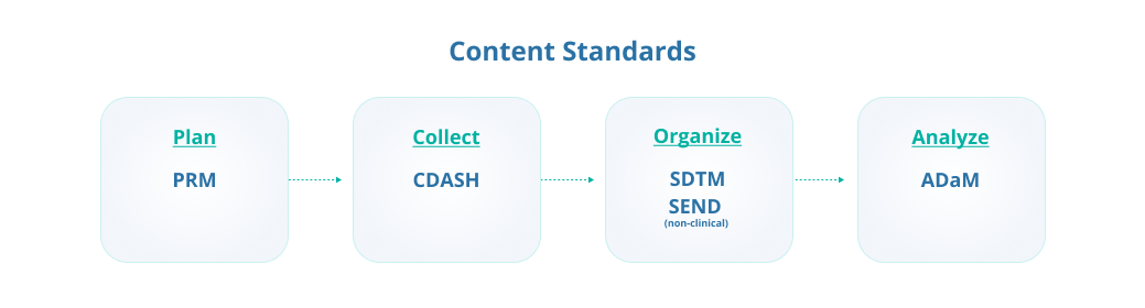 The CDISC foundational or content standards define what objects are allowed. These standards provide the basis for other CDISC standards that support data collection, management, analysis, and reporting.